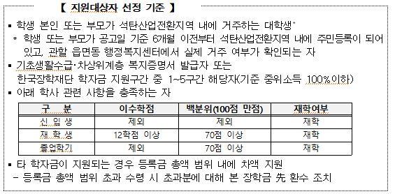 Áö¿ø ´ë»óÀº Çлý º»ÀÎ ¶Ç´Â ºÎ¸ð°¡ °ø°íÀÏ ±âÁØ 6°³¿ù ÀüºÎÅÍ ¼®Åº»ê¾÷ÀüȯÁö¿ªÀΠŹ顤»ïô¡¤¿µ¿ù¡¤Á¤¼± Áö¿ª¿¡ Áֹεî·ÏÀ» µÎ°í ½ÇÁ¦ °ÅÁÖÇÏ´Â ´ëÇлýÀÌ´Ù.